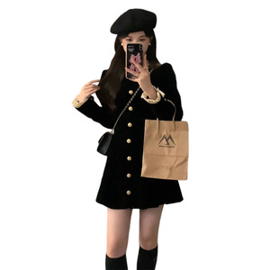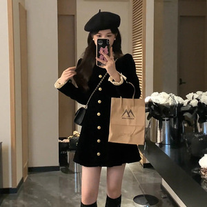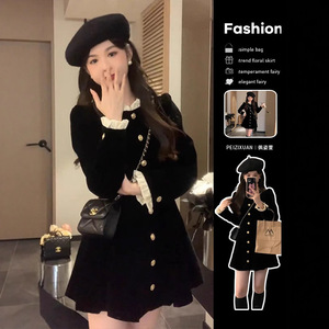 法式小香赫本风黑色高级丝绒连衣裙子女秋冬季气质收腰短裙女装潮
