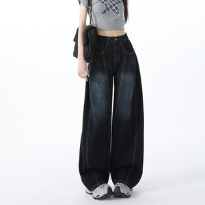 2025秋季美式复古刺绣弯刀阔腿牛仔裤女新款高腰直筒宽松拖地裤