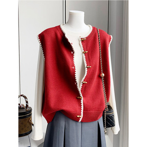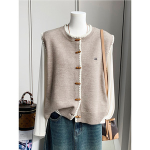 女士文艺纯色开衫马甲2025春秋新款宽松背心圆领牛角木扣针织马夹
