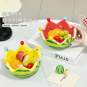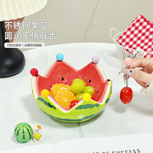 高颜值西瓜水果叉果盘套装家用装饰摆件可爱不锈钢果叉果签收纳盘