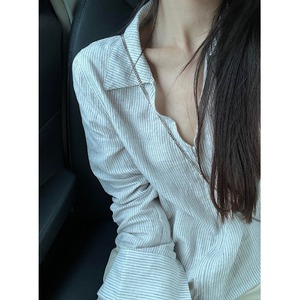 纯棉拉链条纹v翻领衬衫女2025新款爆款夏季宽松衬衣薄款开衫上衣