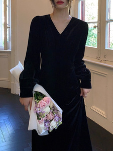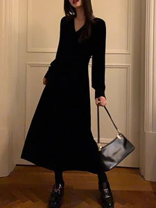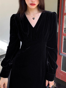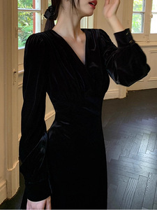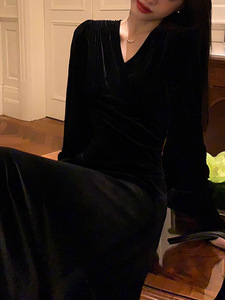 高级感丝绒连衣裙女新款法式气质v领收腰显瘦中长款裙子