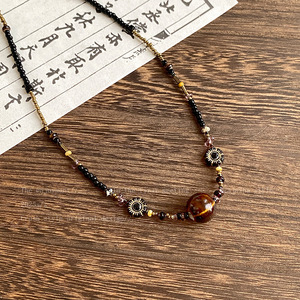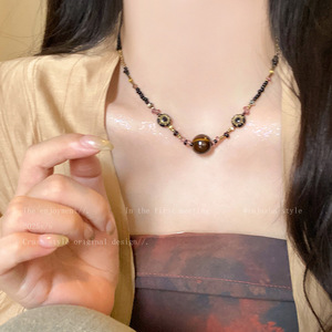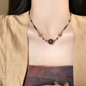 民族风复古咖色串珠项链女时尚圆球吊坠锁骨链小众百搭文艺配饰