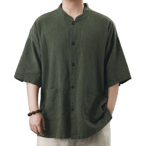 夏季新款国风棉麻男士短袖衬衣中式复古立领休闲衬衫宽松百搭上衣