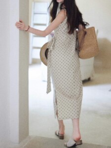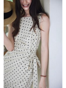 贰羊设计【松间月】高级感气质波点连衣裙女侧收腰亚麻棉法式长裙