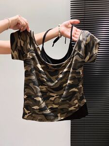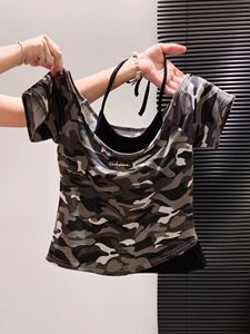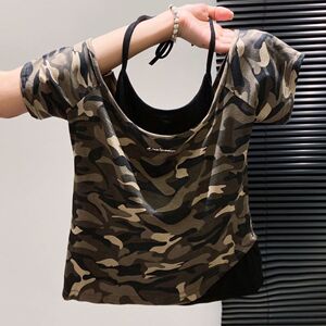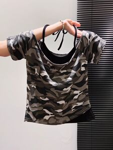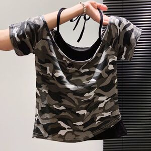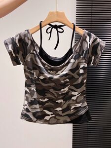 军绿色迷彩挂脖短袖t恤女夏季2025新款辣妹短款修身显瘦露肩上衣
