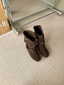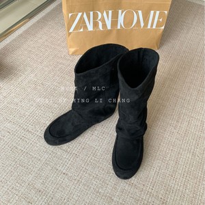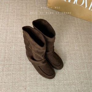 2025春秋女士麂皮圆头平底气质内增高3CM一脚蹬长筒靴烟管靴