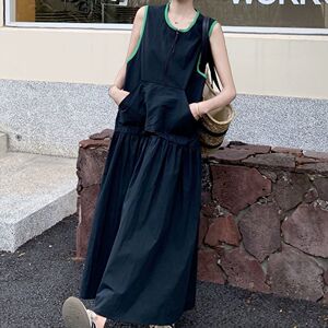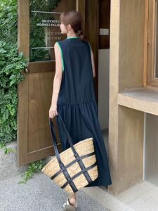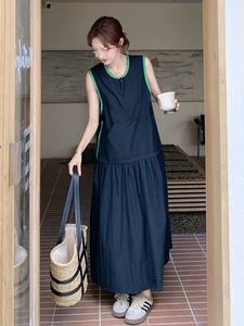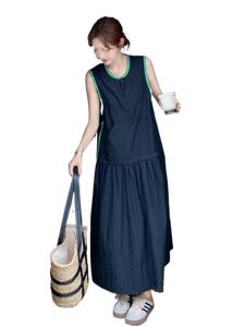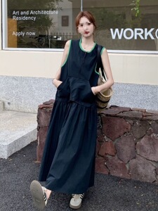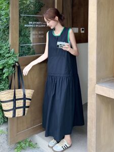文艺圆领撞色边系带背心连衣裙藏青白色拉链长裙肩带款文艺复古