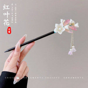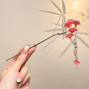 86#西瓜红杏叶枝叉流苏发簪-银色 (袋装)