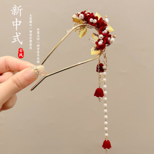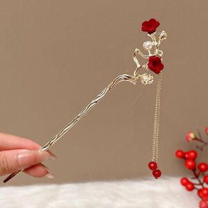 1#植绒红色花红珠吊坠发簪-金色 (袋装)