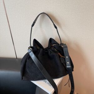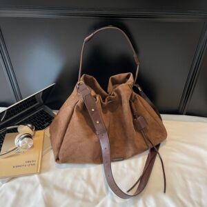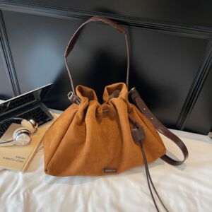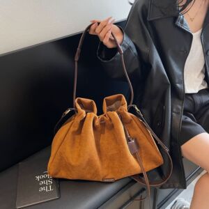 跨境大容量磨砂绒水桶包包女bags韩系复古抽绳百搭斜挎通勤单肩包