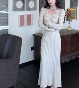 赫本风圆领修身针织打底连衣裙女秋冬优雅高腰长袖修身气质长裙子