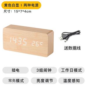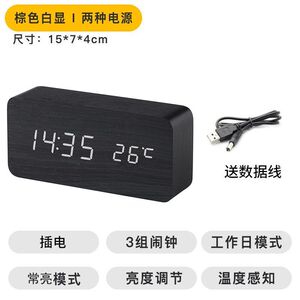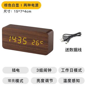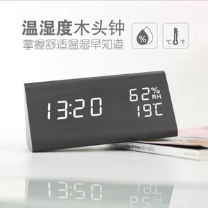 北欧静音木质闹钟桌面复古木纹夜光湿度客厅宿舍黑木白灯棕木黄灯