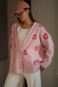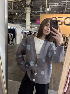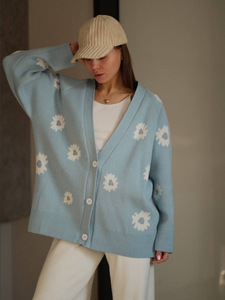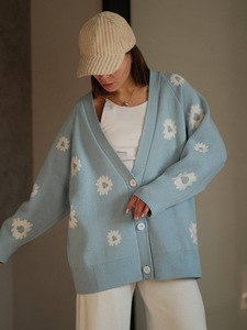 2025秋冬新款宽松清新甜美小雏菊提花开衫毛衣女撞色V领针织外套