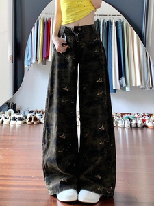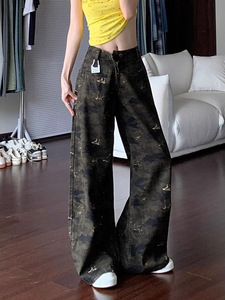 废土风迷彩迷彩阔腿裤秋季新款宽松高腰直筒微喇显瘦微喇牛仔裤女