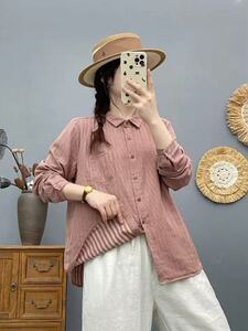 2025春秋款复古文艺范棉纱衬衫女士宽松显瘦竖条纹长袖打底衬衣