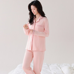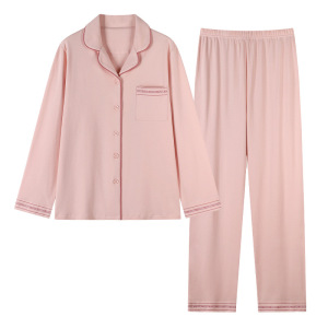100%纯棉女士睡衣长袖25年春秋新品家居服开衫翻领纯色套装睡衣女