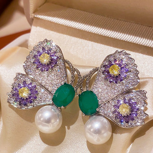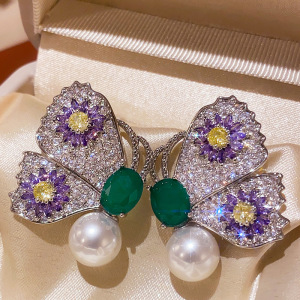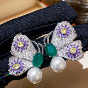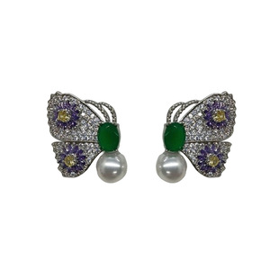 铜镀白金银针锆石蝴蝶珍珠耳环轻奢高级感耳钉精致时尚百搭耳饰女