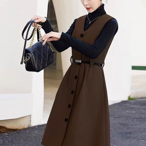 套装【白毛衣+啡色连衣裙】