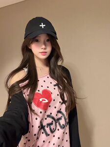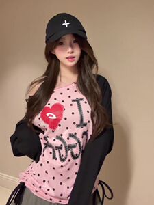 美式爱心波点撞色斜肩长袖女2025秋季新款插肩袖T恤宽松纯棉上衣