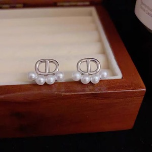 s925银针气质时尚简约CD字母天然珍珠耳钉精致小巧设计感耳环批发