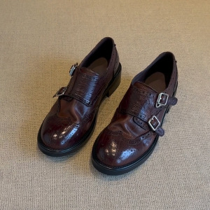 牛皮版~复古雕花孟克鞋圆头金属扣一脚蹬粗跟小皮鞋英伦风乐福鞋