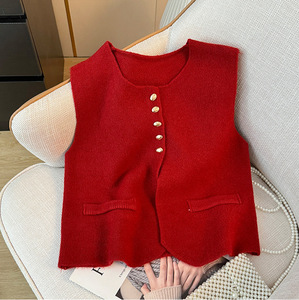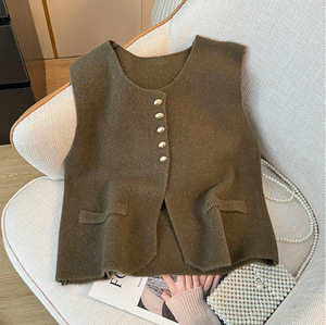 韩系简约圆领小金扣针织马甲女2025春秋百搭无袖坎肩外搭毛衣背心
