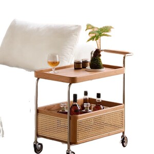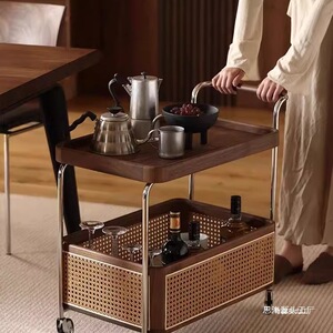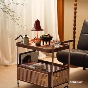 实木边几中古小推车可移动茶几客厅沙发边柜零食置物架藤编收