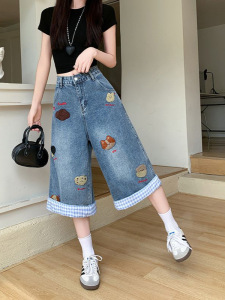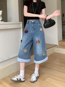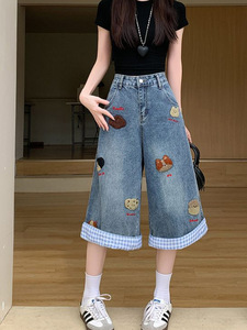 美式水洗做旧刺绣七分裤女夏牛仔七分牛仔裤女阔腿小个子宽松显瘦