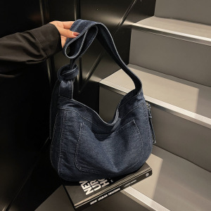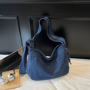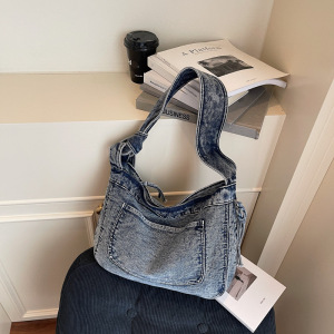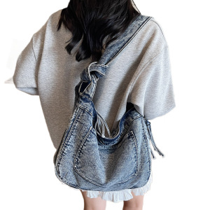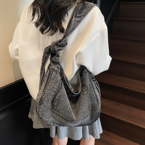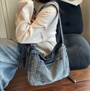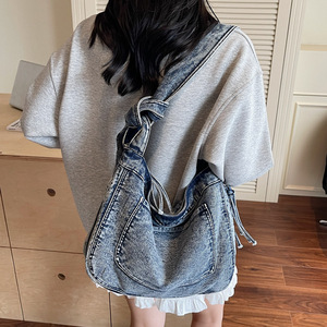 跨境新款女包复古磨损做旧风牛仔包包大容量设计感单肩斜挎托特包
