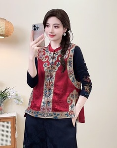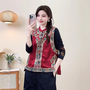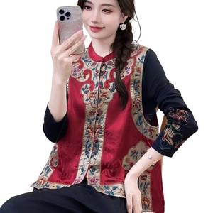 新中式马夹女2025新款民族风马甲女刺绣缎面提花坎肩立领盘扣背心