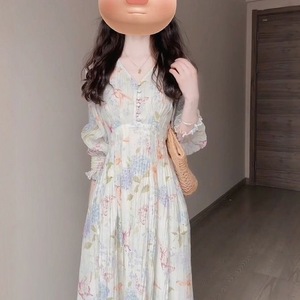 春秋新款收腰法式茶歇连衣裙女森系v领气质雪纺碎花长裙绝美温柔