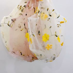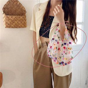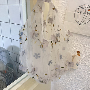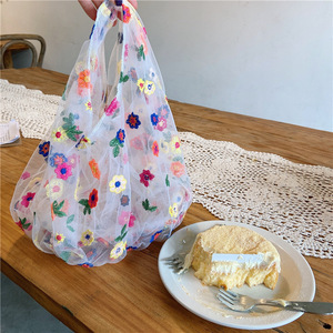 03281韩国ins半透明绢网刺绣花朵包包碎花仙女小清新网纱手拎袋