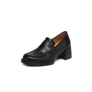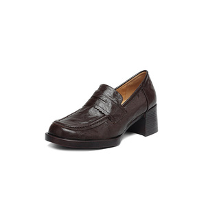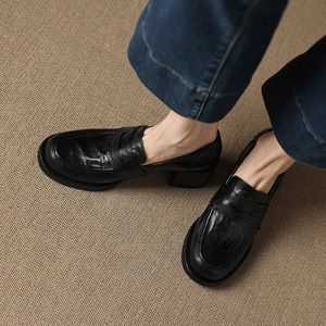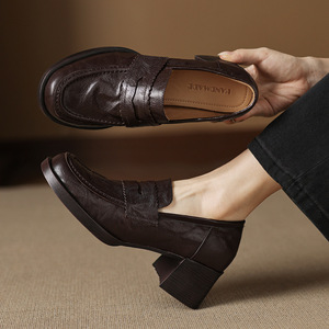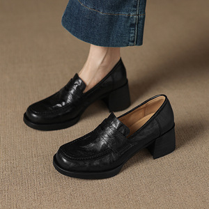 配小西装头层羊皮乐福鞋2025秋粗中跟通勤小皮鞋圆头真皮深口单鞋