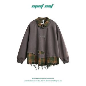 Mint Cat 2025春季新品实拍美式复古格纹拼接假两件套头卫衣
