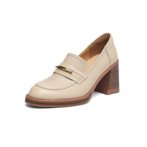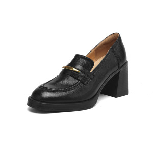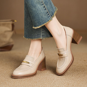舒适气质通勤高跟乐福鞋2025秋金属扣粗跟厚底圆头真皮深口单鞋女