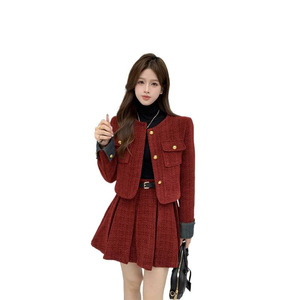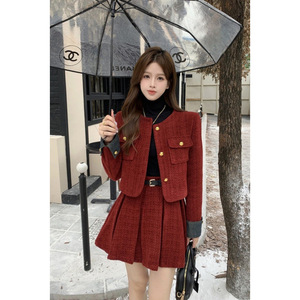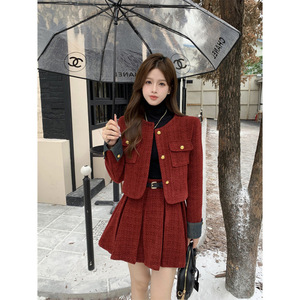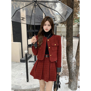 红色小香风套装裙两件套秋冬新款时尚气质名媛外套+百褶裙两件套