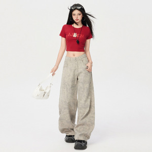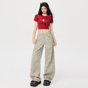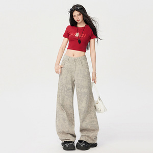 新中式大直筒牛仔裤女秋季新款设计感扎染宽松显瘦休闲阔腿拖地裤