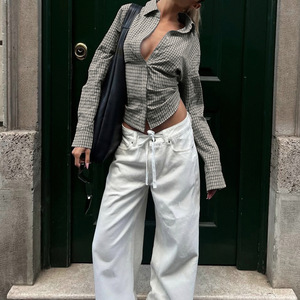 跨境新品秋季复古格纹撞色T恤气质通勤收腰系带排扣长袖衬衫上衣