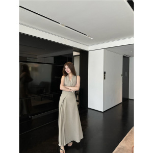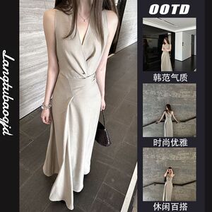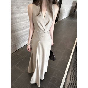 韩系新款2025时尚一片式收腰连衣裙法式气质v领显瘦无袖长裙女夏