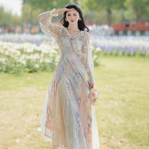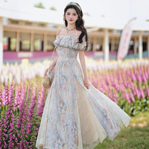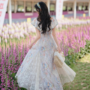 法式超仙蕾丝网纱吊带连衣裙度假仙女收腰大摆长裙子设计感碎花裙