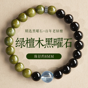 天然绿檀木质佛珠双圈手串黑曜石海蓝宝水晶纳福百搭小众男女手链