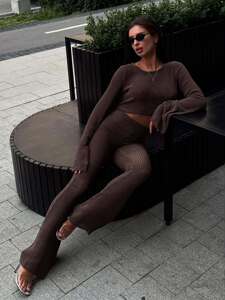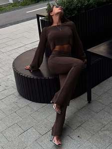 2025秋季新款跨境欧美短款露脐针织衫女高腰显瘦微喇型针织套装秋