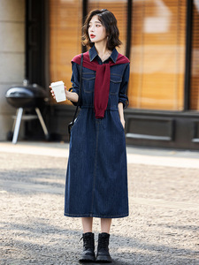 2025秋季新款复古气质长袖宽松显瘦牛仔存款连衣裙 配披肩 E926