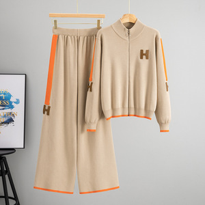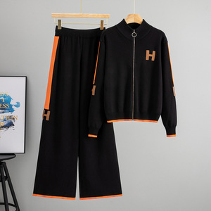 跨境针织时尚字母套装女秋冬圆领拉链开衫外套休闲阔腿裤两件套