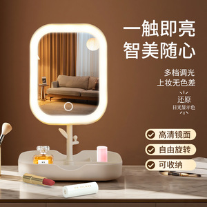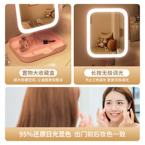 LED化妆镜子带灯桌面台式单面可旋转公主镜带收纳学生宿舍补光镜