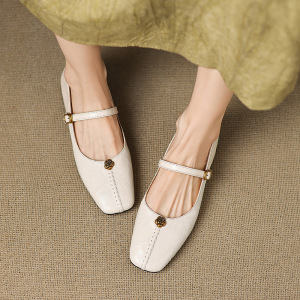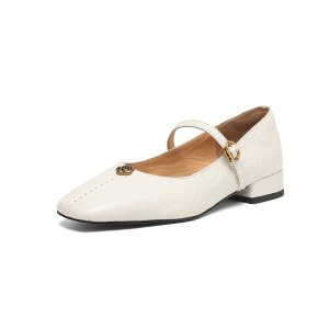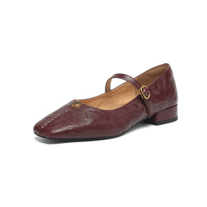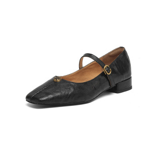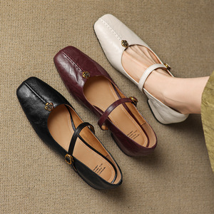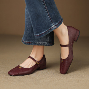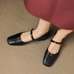 高知穿搭~舒适通勤头层羊皮玛丽珍2025秋粗低跟方头真皮花朵单鞋