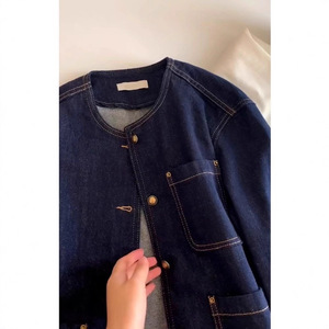 深蓝色复古圆领正肩牛仔外套女春季小众显瘦学生短款工装休闲上衣