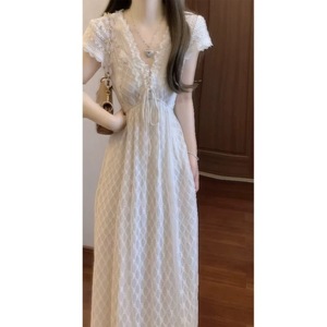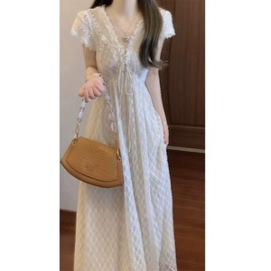 法式重工手作连衣裙 V领长裙蕾丝气质显瘦A字裙高腰茶歇裙 夏2025