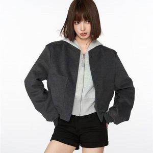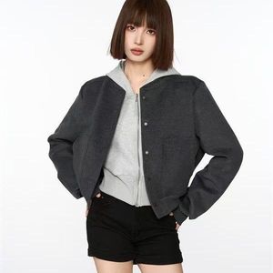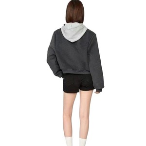 美式复古灰色连帽卫衣外套女秋季加绒加厚小个子短款收腰开衫上衣